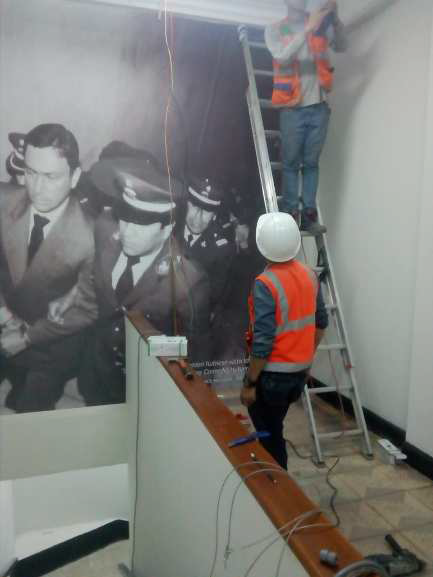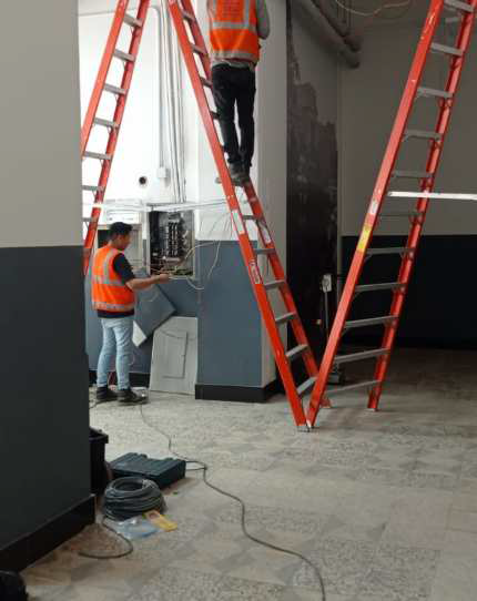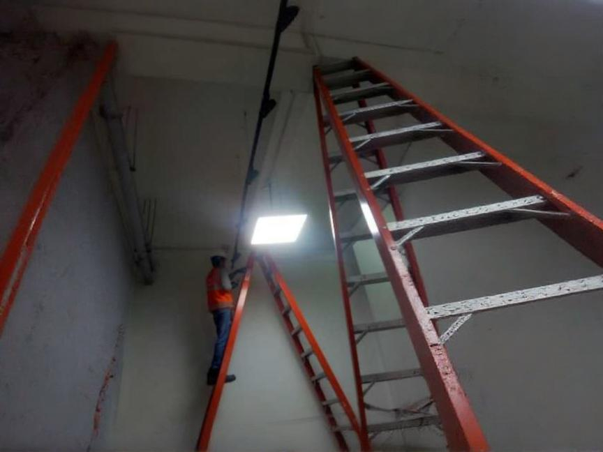 Instalación de 104 luminarias decorativas, rieles, tubos conduit EMT, cables eléctricos, interruptores de pared e interruptores termomagnéticos.